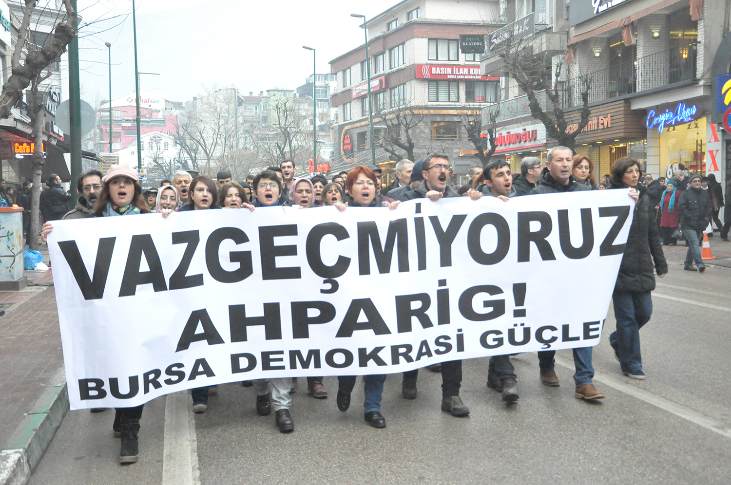 Bursa Demokrasi Güçleri’nin çağrısıyla demokrasi, adalet ve barış savunucuları katledilişinin 12. yılında Hrant’ın katillerinden hesap sormak için toplandı. “Vazgeçmiyoruz Ahparig” pankartı arkasında Heykel’e yapılan yürüyüşün ardından basın açıklamasını Figen Ovat okudu.