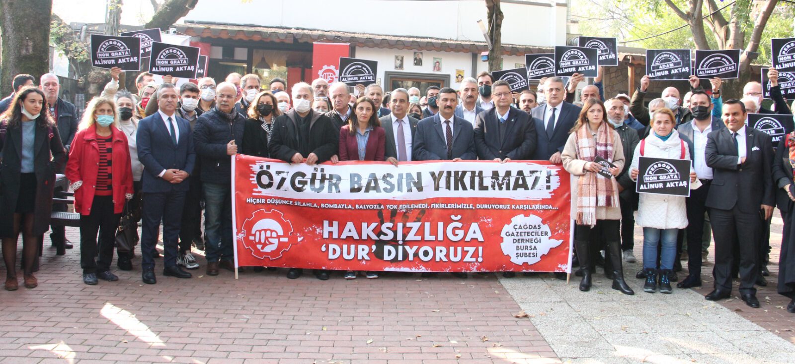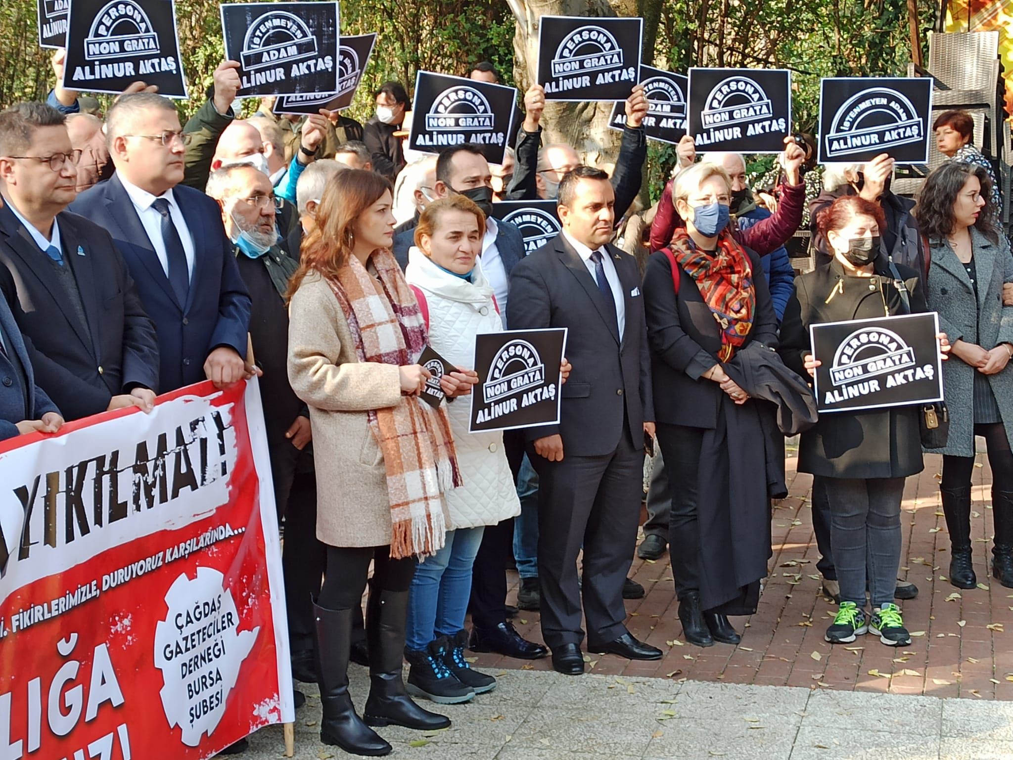 Öteden beri savunduğumuz tüm demokratik kazanımlarımıza, bizi biz yapan tüm değerlere düşman! Kindar! İntikam besleyen bir başkan… İktidarın Bursa’daki temsilcisi, susturamadığı gazetecilerin evine gözünü dikmiştir. Yersiz, yurtsuz bırakmak istemektedir. Bu, Türkiye Cumhuriyeti’nin demokratik, laik ve sosyal bir hukuk devleti niteliğinden uzaklaştırılarak parti devleti haline dönüştürülmesi yolunda gazetecilerin susturulmak istenmesinin son örneğidir. 90’lı yılların başında Çağdaş Hukukçular Derneği ile birlikte eş zamanlı bombalandı bu dernek. İBDA-C atmıştı bombayı! Aynı anda isminde ‘çağdaş’ olan iki derneğin hedefe konması, nasıl bir yaşam biçimine karşı olduklarının kanıtıydı. Bugün yıkılmak istenmesinin gerekçesi de adının ‘çağdaş’ olması değil mi zaten? Hep birlikte haykırıyoruz. Siz ancak duvarları yıkarsınız. Bizi değil! Özgür Basın Yıkılmaz” dedi.