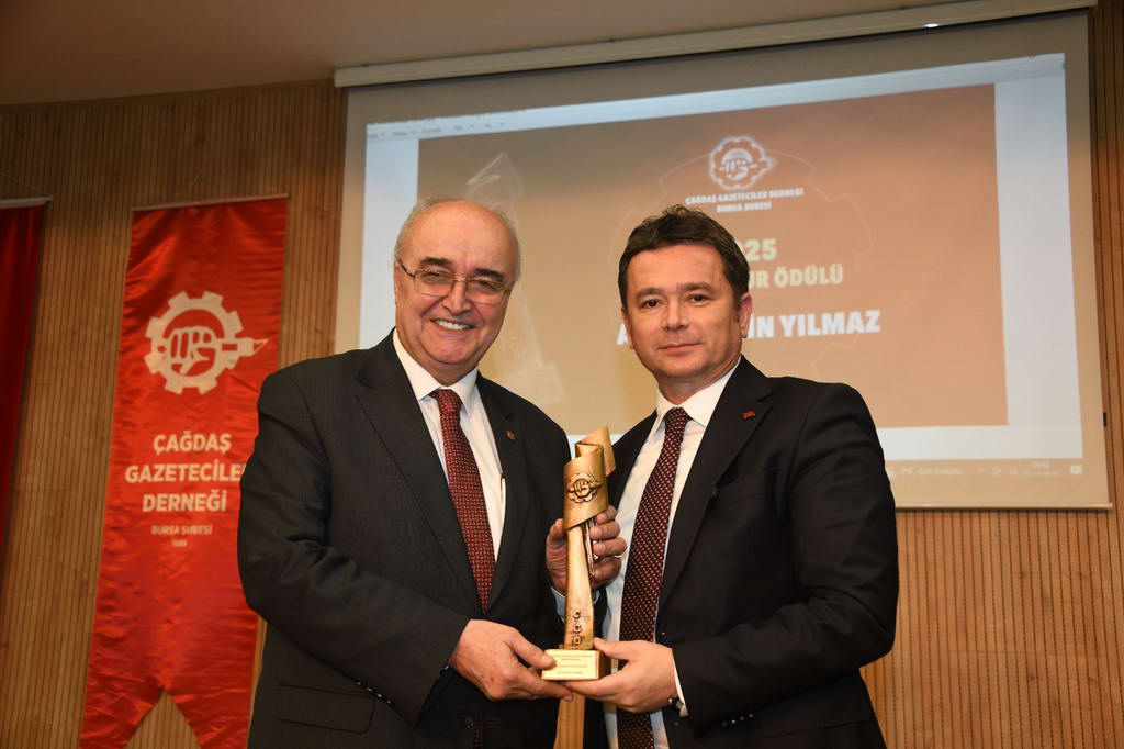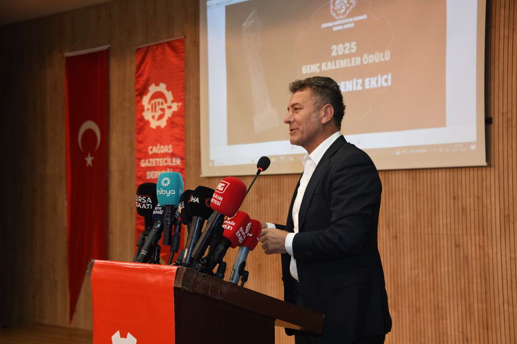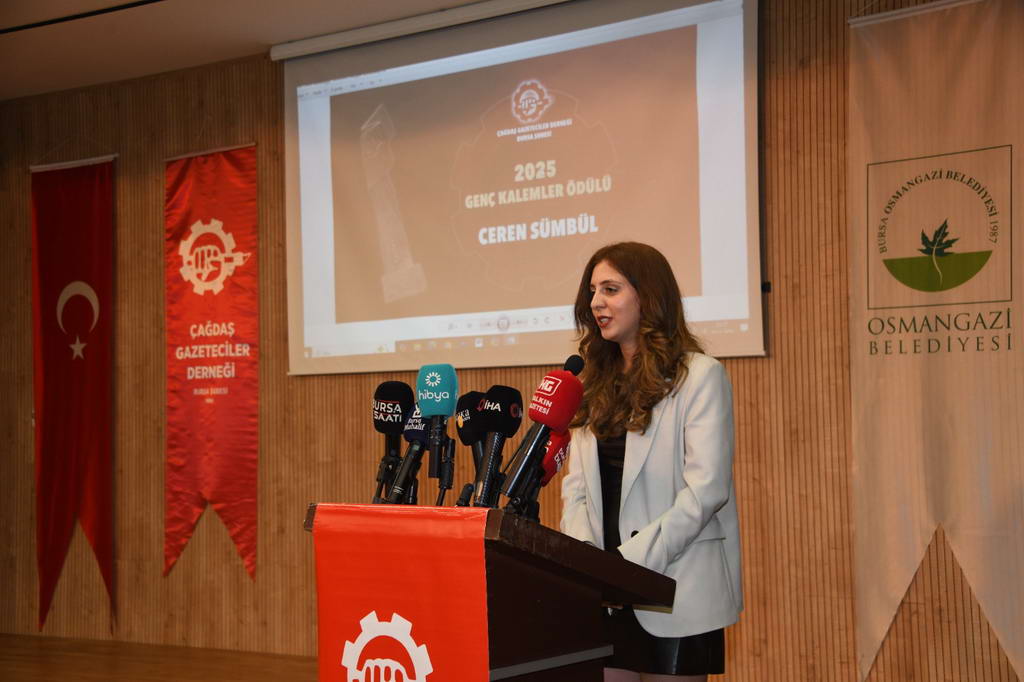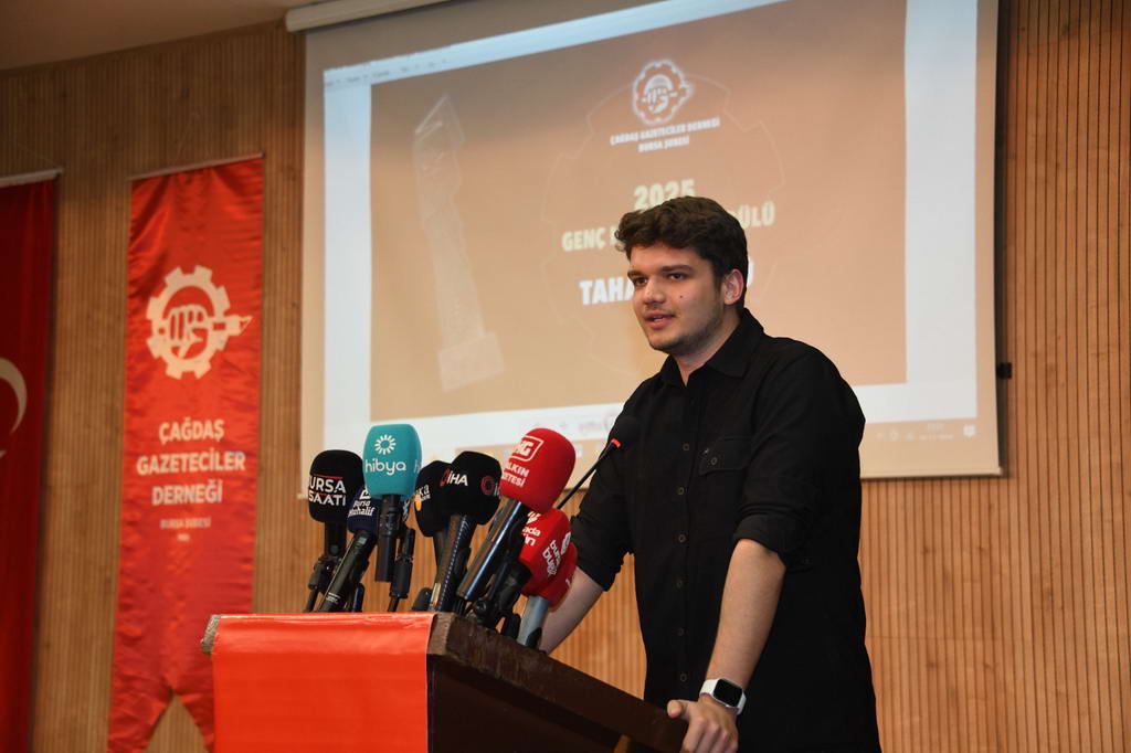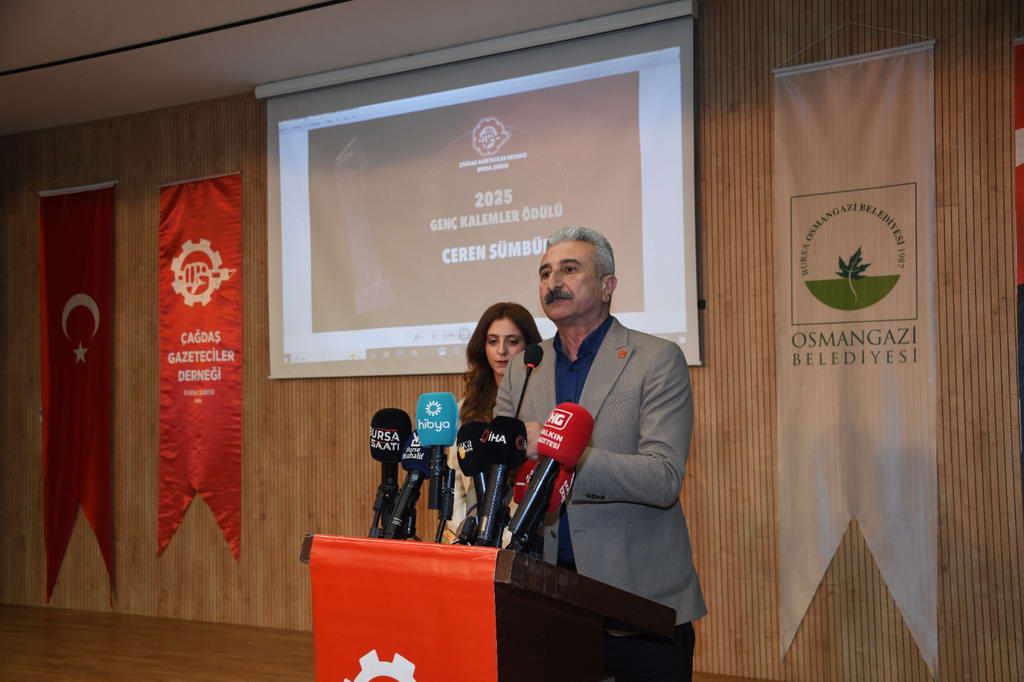 Çağdaş Gazeteciler Derneği (ÇGD) Bursa Şube Başkanı Tayfun Çavuşoğlu, sunuculuğunu Sevda Kurul ve Hatice Nur Derya’nın yaptığı ödül törenindeki konuşmasında, gerçeğin peşinden koşmanın ağır bedeller gerektirdiğine işaret ederek, “Bu zorlu dönemde, mesleki dayanışmamızı göstermek ve basın özgürlüğü mücadelesini bir kez daha haykırmak için bir aradayız. Gazeteciliğin, demokrasinin temel direği olduğu bilinciyle; halkın haber alma hakkını savunmak, sadece gazetecilerin hakkı ya da görevi değil, aynı zamanda demokratik ve sağlıklı bir toplumun hava koşulu gibidir. Türkiye’de gazetecilik, ne yazık ki 2025 yılı itibarıyla ağır baskı altında nefes almaya çalışmaktadır” dedi.