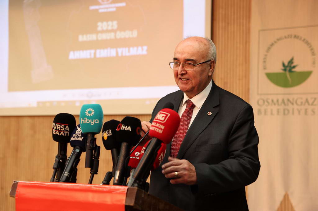 Basın Onur Ödülü’ne layık görülen Olay Gazetesi Yazarı Ahmet Emin Yılmaz ödülünü Osmangazi Belediye Başkanı Erkan Aydın’ın elinden aldı. Başkan Erkan Aydın, meslekte 48 yılını geride bırakan Ahmet Emin Yılmaz’ı kutlayarak, “Bu ödülü 50’nci yılda vermek isterdim, inşallah 2 sene sonra 50’nci yılda da birlikte oluruz” dedi. Aydın, 10 Aralık İnsan Hakları Günü’ne de atıfta bulunduğu konuşmasında, son bir yılda bütün dünyada 67 gazetecinin mesleğini icra ederken öldürüldüğüne işaret ederek, Türkiye’de ise gazetecilerin cezaevine gönderildiğini belirtti. Aydın, “Umudumuzu kaybetmeyelim” çağrısında bulundu.