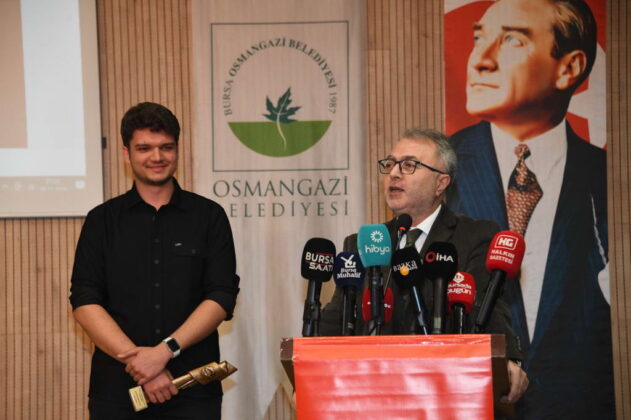 Sahanın en zorlu koşullarında görev yapan Harmancık TV Muhabiri Gökhan Batbay’a “Fikri Takip – Habercilik” ödülünü Gemlik Belediye Başkanı Şükrü Deviren verdi.
